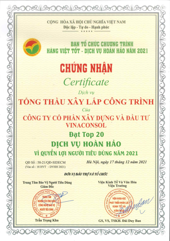 Qua hơn 3 tháng triển khai chương trình, vượt qua hơn 300 bộ hồ sơ đăng ký tham gia của các tổ chức, cá nhân trong cả nước. VINACONSOL đã vinh dự nằm trong TOP 20 DỊCH VỤ HOÀN HẢO vì quyền lợi người tiêu dùng, sánh vai cùng các thương hiệu, công ty nổi tiếng khác như: Tổng Công Ty bảo Hiểm Hàng Không, Bệnh Viện Bạch Mai, VNPT, Xi Măng The Vissai, Mường Thanh Luxury ….và nhiều thương hiệu, sản phẩm, dịch vụ uy tín khác.